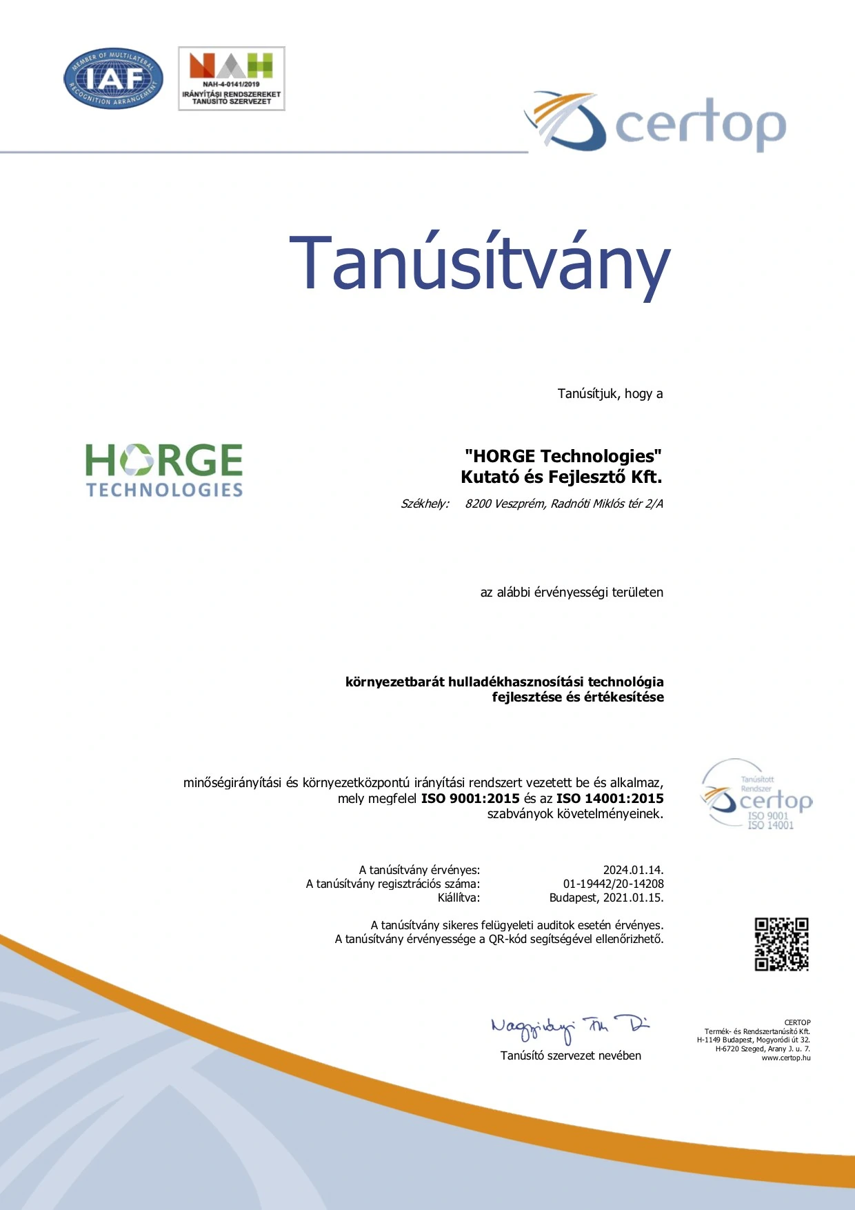 Örömmel jelentjük be, hogy 2021 januárjában a Horge megszerezte az ISO 9001 és ISO 14001 minősítéseket.